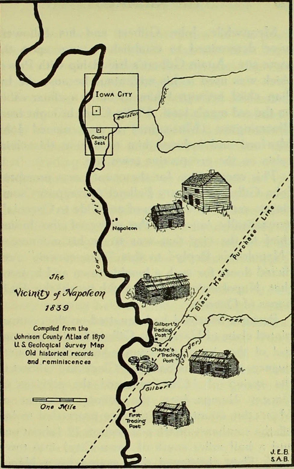 - 1835. John Gilbert (Prentice) arrives in Johnson County to oversee the American Fur Company trading post on the Iowa River. Gilbert is Johnson County’s first white settler. (2), (3), (4)