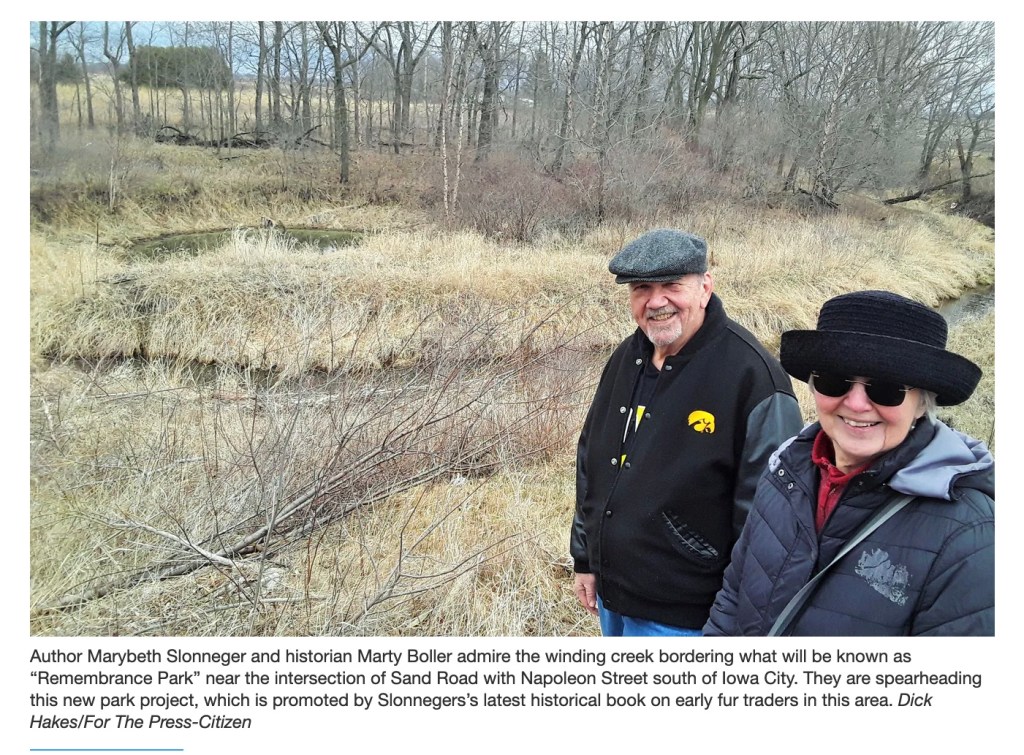 Today, Johnson County Remembrance Park is situated on Sand Road in Johnson County, near the junction of what is now Snyder Creek, Sand Road and the Iowa River. The Remembrance part of the name commemorates the meeting of two distinct cultures: the old Americans, who were represented by Poweshiek, leader of the Meskwaki band that settled in a nearby cove of the river, and John Gilbert, the representative of the new Americans, who traded with them.